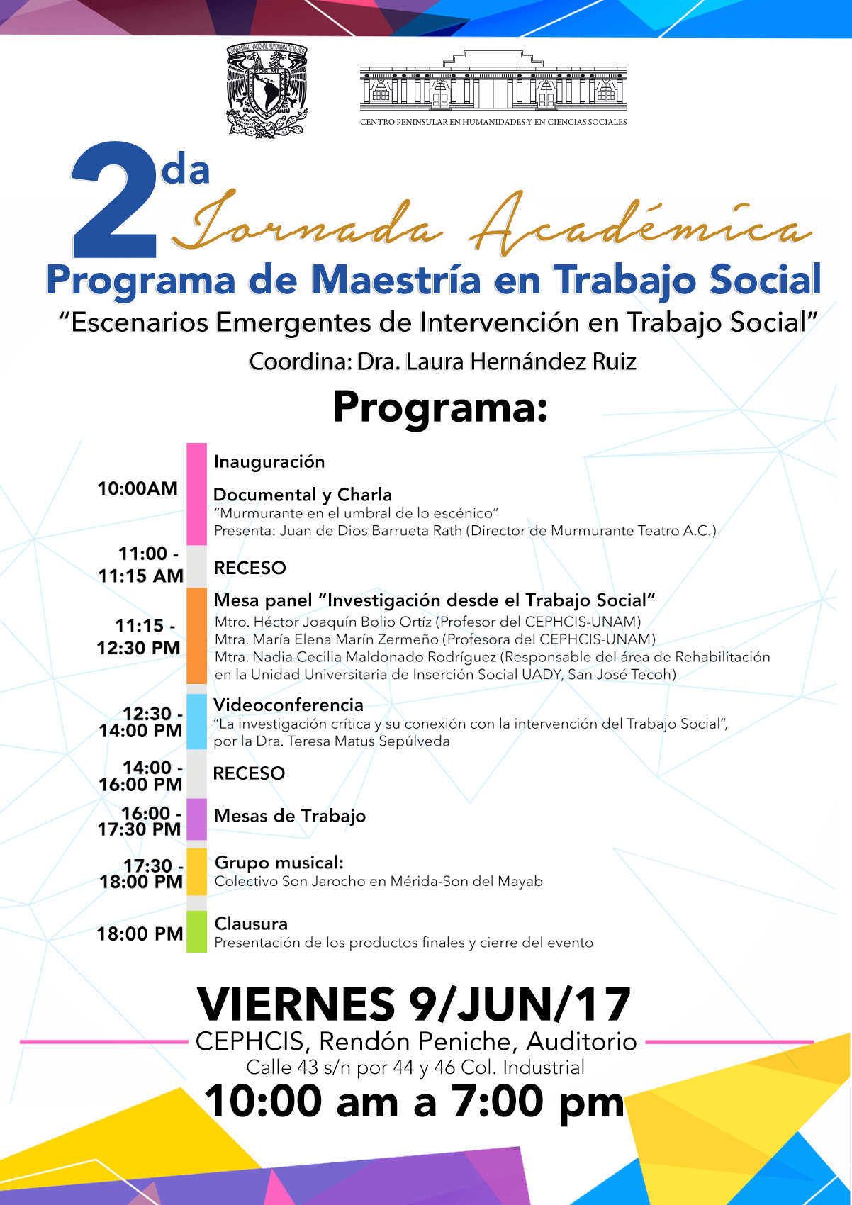 En este sentido, los estudiantes y egresados de la Maestría en Trabajo Social del Centro Peninsular en Humanidades y en Ciencias Sociales (CEPHCIS) de la UNAM, realizarán la 2a Jornada Académica del Programa de Maestría en Trabajo Social: “Escenarios emergentes de Intervención en Trabajo Social” el próximo viernes 9 de junio, bajo la coordinación de la Dra. Laura Hernández Ruiz, investigadora del CEPHCIS.
